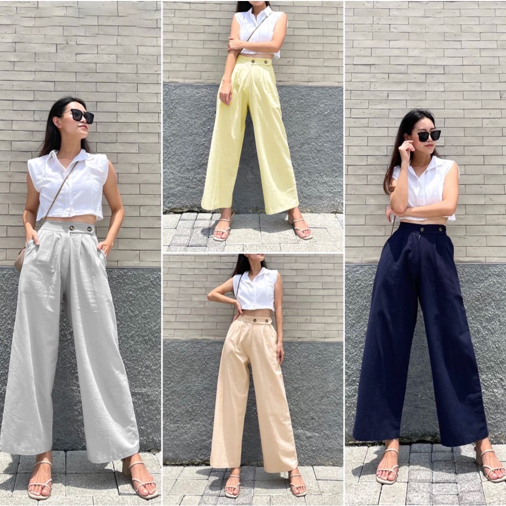 HOPYLOVY Celana Kulot Wanita Katun Linen Double Button Jemima / Celana Panjang Wanita Polos